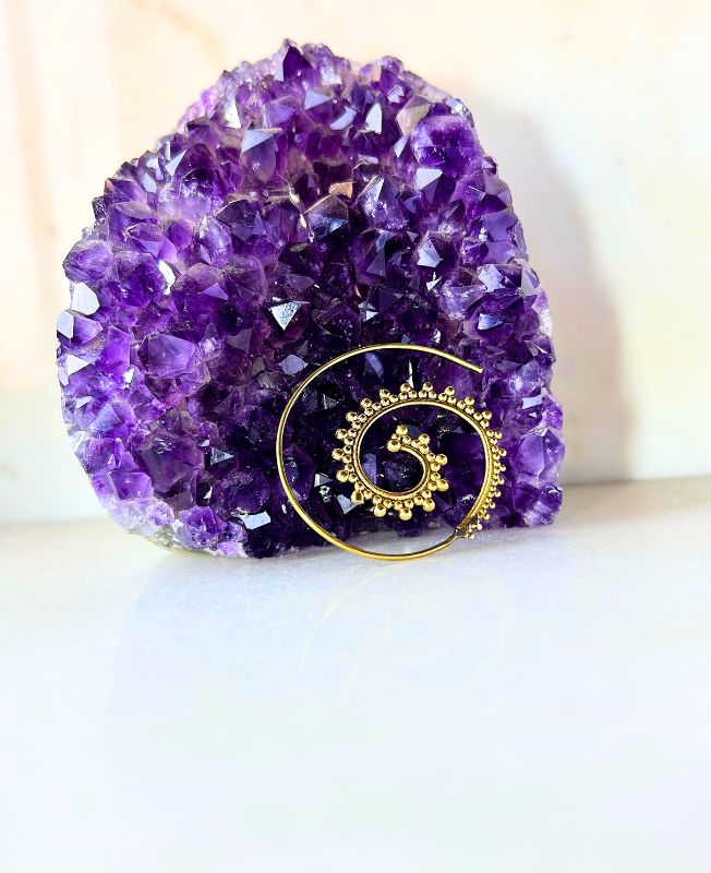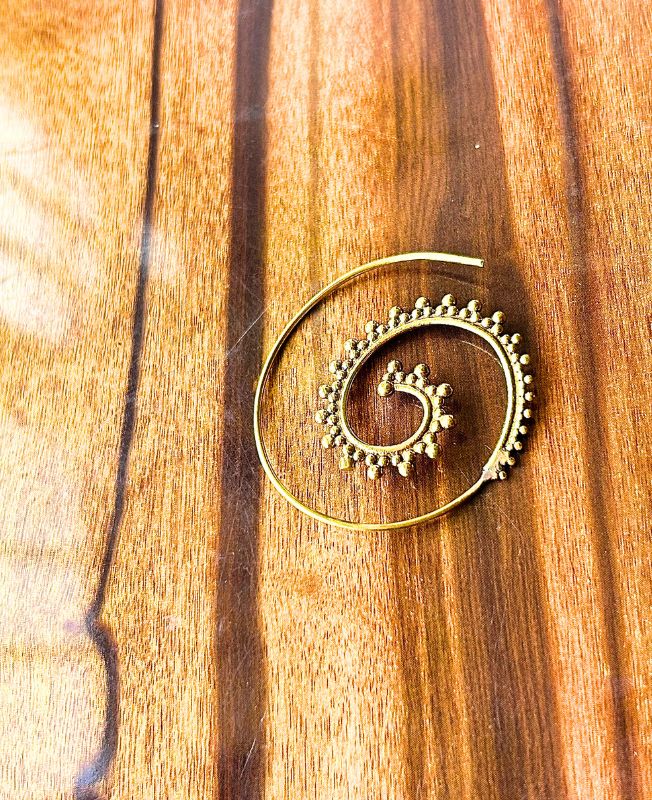 These brass spiral filigree earrings are a beautiful fusion of traditional craftsmanship and contemporary boho style. Hand-crafted from solid brass, each earring features a graceful spiral pattern accented with tiny granulated beads along the curve, symbolizing continuity and flow. The design draws inspiration from tribal and sacred geometry motifs, giving the earrings a timeless appeal.