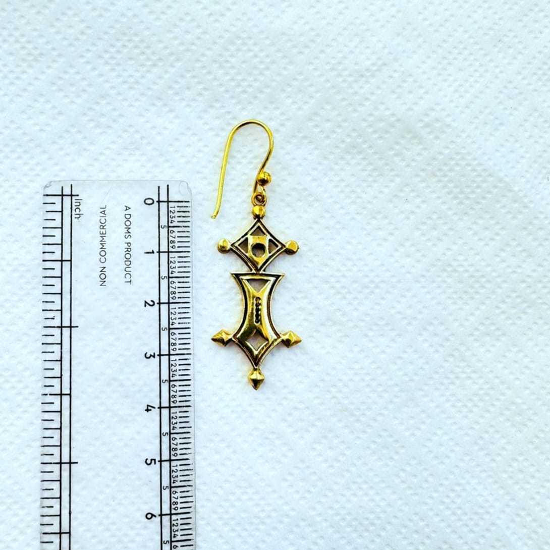These earrings are inspired by the iconic Tuareg Cross, a symbol traditionally used by the Berber people of the Sahara. Crafted from high-quality brass with a radiant golden finish, the design features a central circular cutout and four ornate arms adorned with delicate geometric engravings and pointed tips.