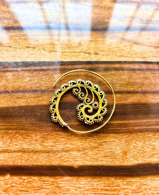 These Brass Spiral Filigree Hoop Earrings are a stunning expression of traditional design blended with contemporary charm. Each earring showcases a graceful spiral pattern surrounded by ornate filigree detailing, hand-polished to achieve a rich golden hue.