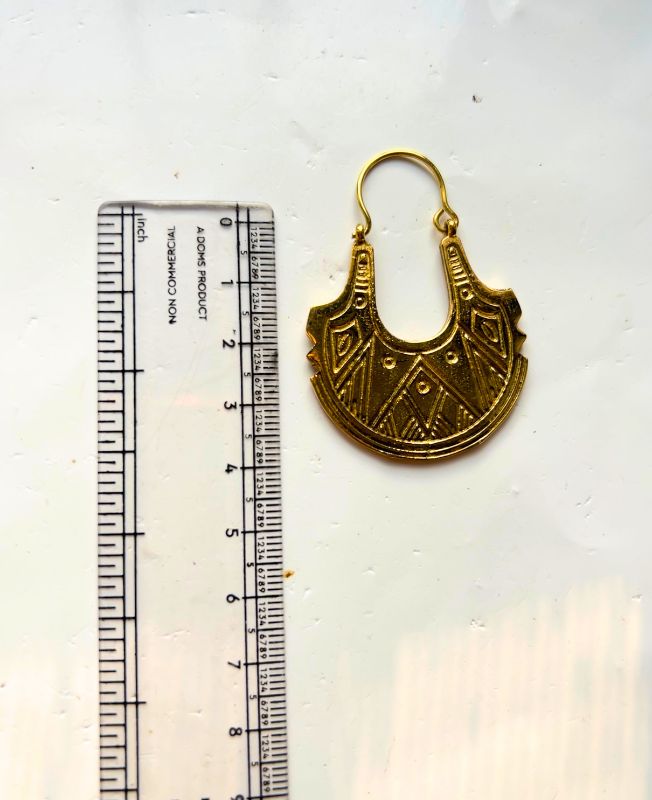 Elegant tribal-style brass earrings with bold geometric design and antique finish. Lightweight yet statement-making, ideal for boho or ethnic-inspired looks.