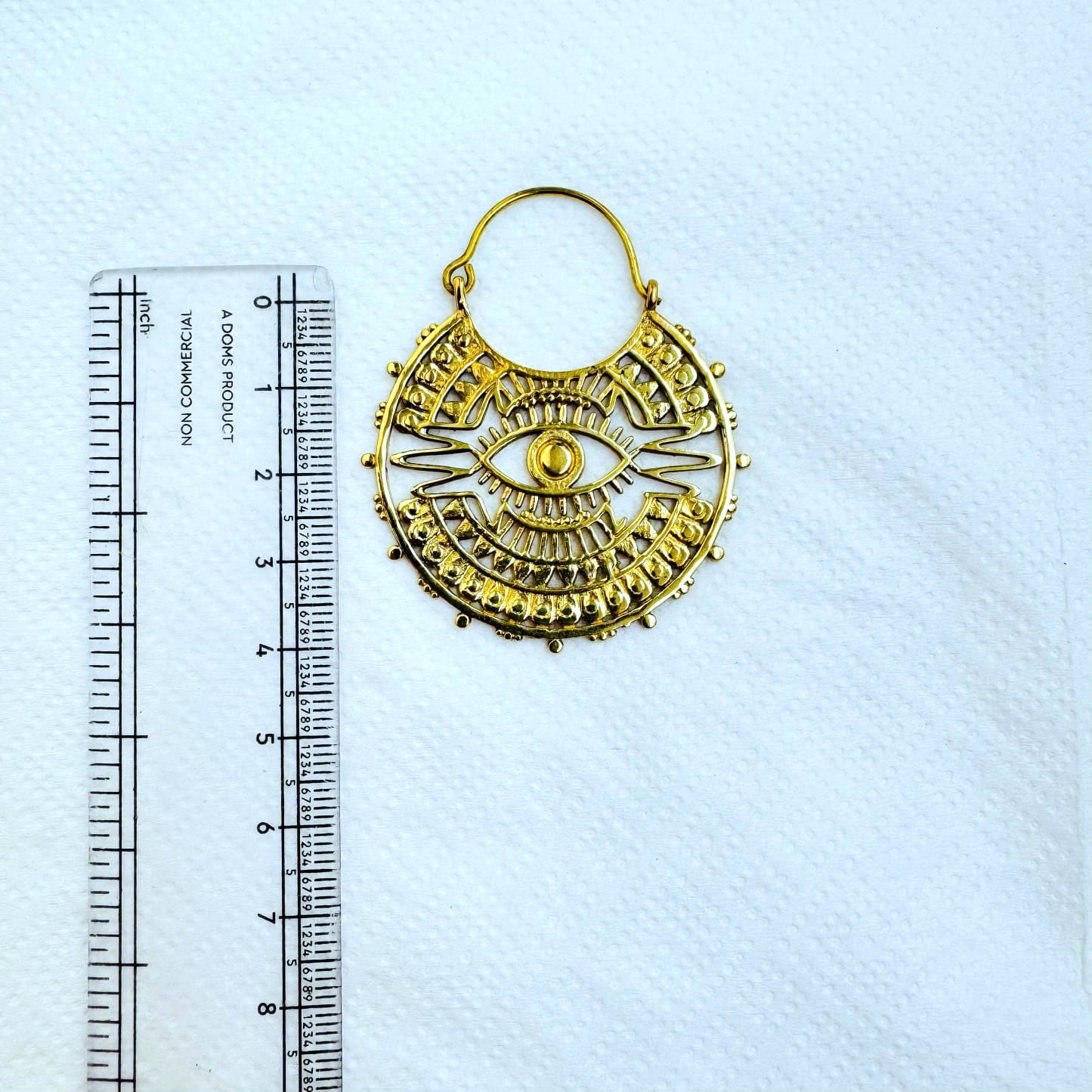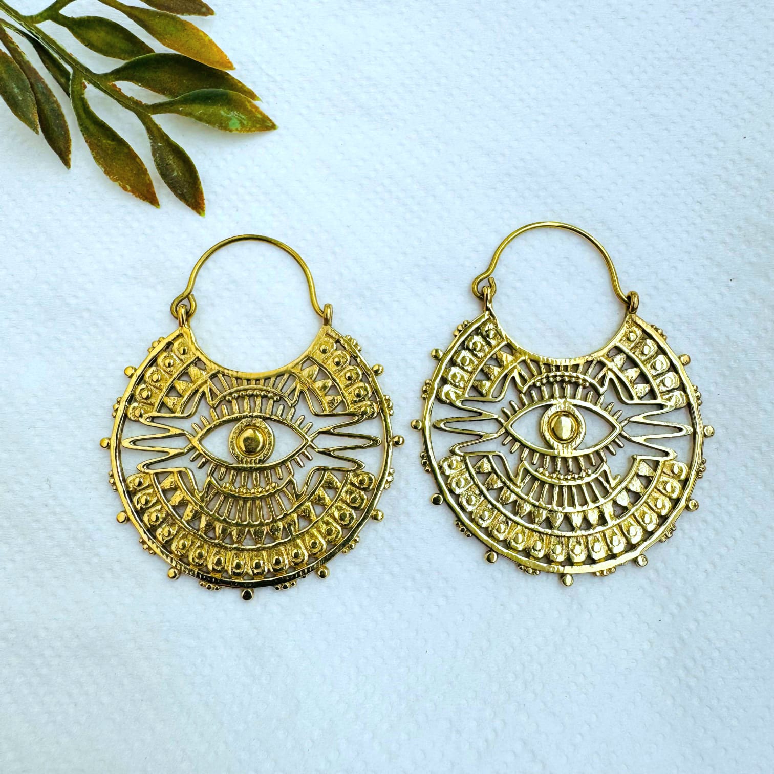 Handcrafted gold plated brass earring featuring a detailed evil eye motif, symbolizing protection and awareness, crafted in an ornate boho tribal style.