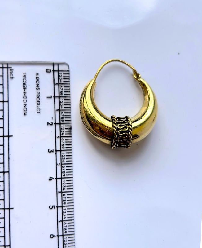 Bold and smooth crescent brass earring with an ornate filigree center band. A classic statement piece with ethnic roots and timeless elegance.