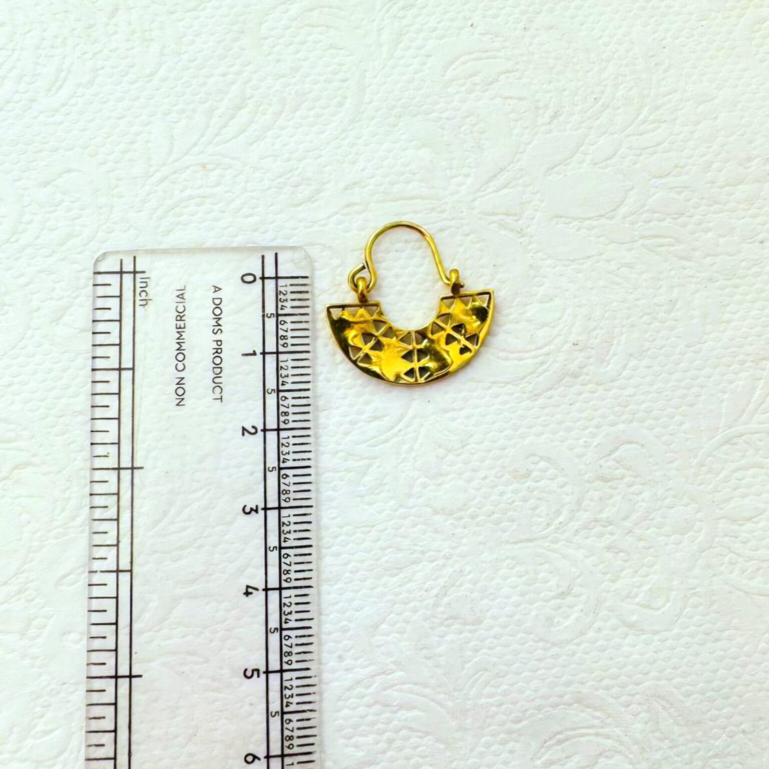 Handcrafted gold plated brass earring featuring an intricate geometric filigree pattern and a classic semi circle silhouette. Lightweight and perfect for a bold yet elegant look.