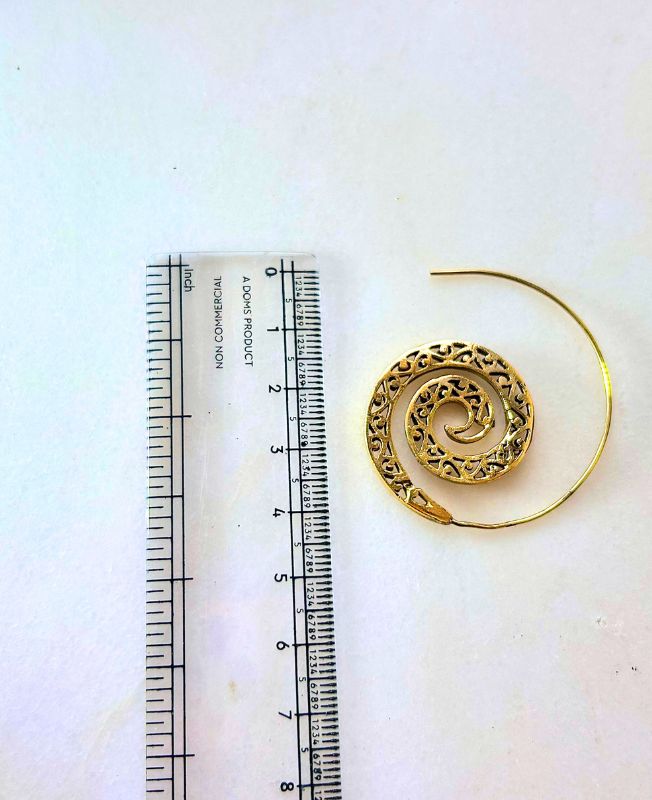 Elegant handcrafted brass spiral earrings with intricate filigree detailing, inspired by ancient tribal designs. Lightweight and versatile, they add a bohemian yet timeless touch to any look.