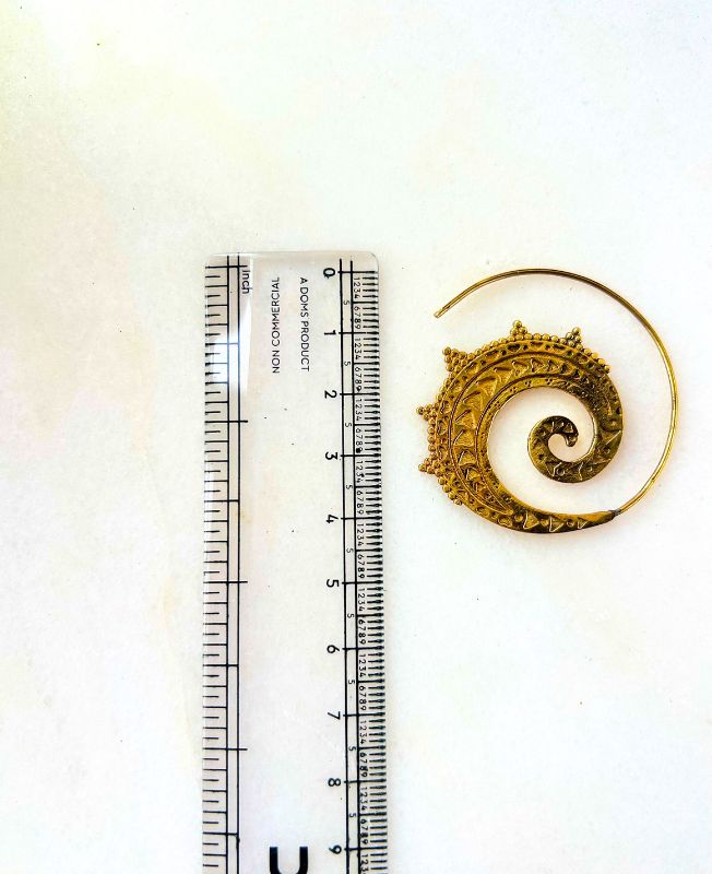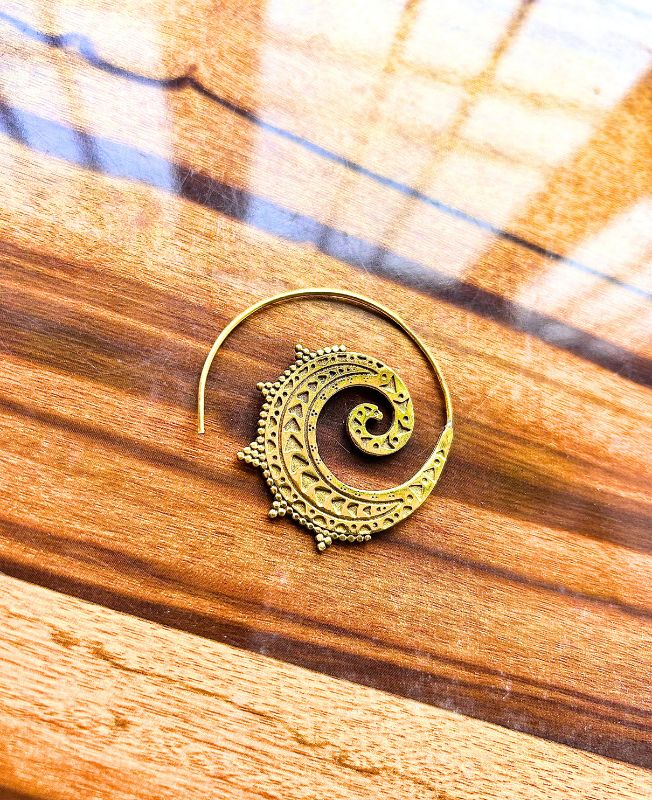 Elegant brass earring crafted in a spiral filigree design, combining traditional craftsmanship with a modern boho flair.