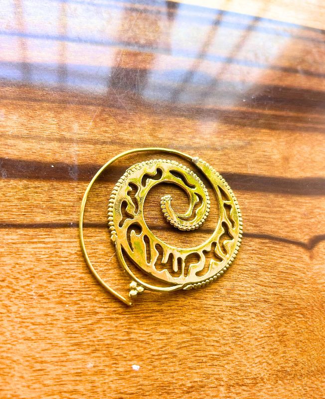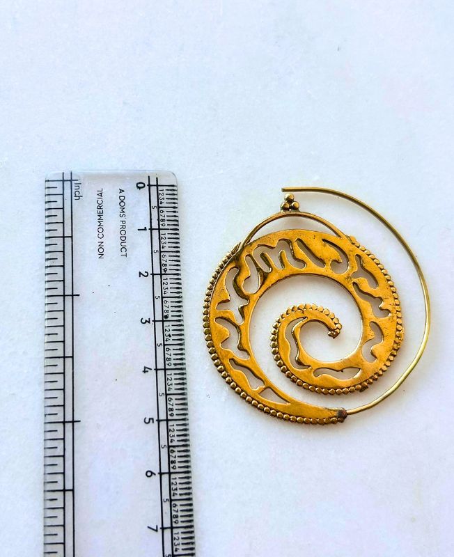 Artistic brass spiral earrings with flame-inspired filigree detailing, blending bohemian charm and ancient symbolism in a bold circular design.