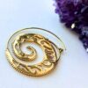 Artistic brass spiral earrings with flame-inspired filigree detailing, blending bohemian charm and ancient symbolism in a bold circular design.