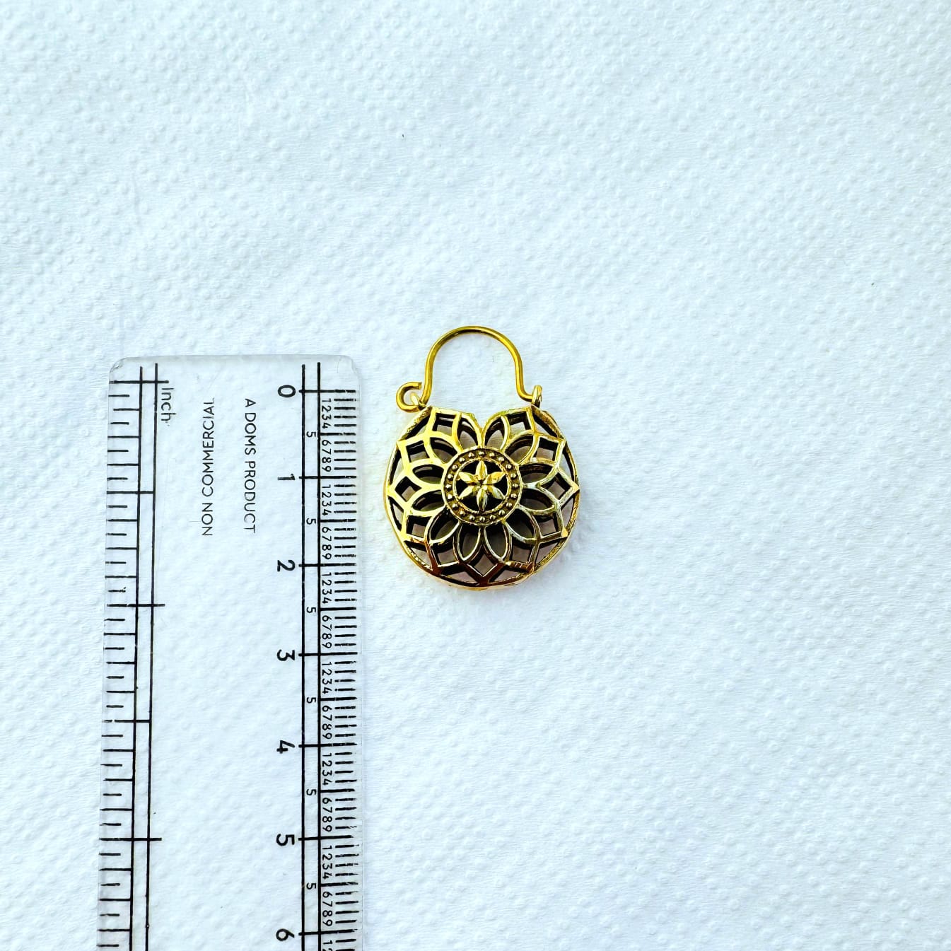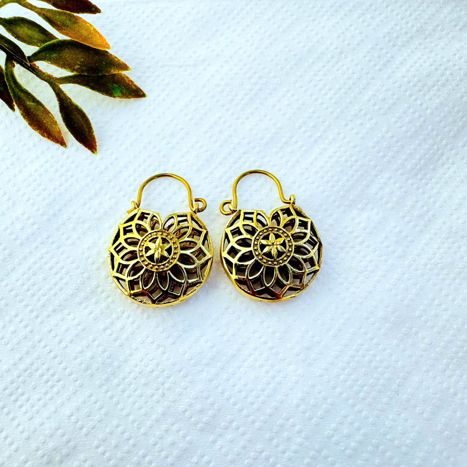 These handcrafted brass earrings showcase a detailed mandala-inspired floral pattern set within a rounded silhouette. The layered cut-out design creates depth and symmetry, allowing light to pass through while highlighting the fine craftsmanship of the piece.