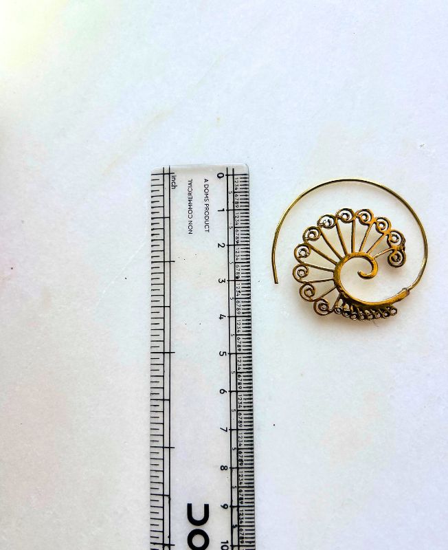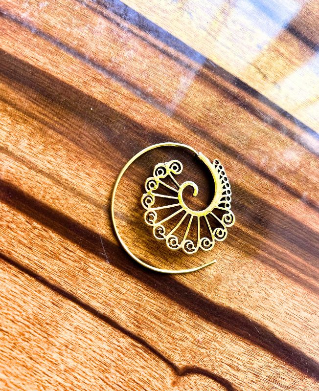This stunning brass spiral filigree earring showcases detailed handcrafted artistry, creating a flowing, circular pattern inspired by ancient motifs. Designed to capture light and movement, it complements both casual and statement outfits beautifully. Each curve and swirl reflects careful craftsmanship, giving the piece a timeless and authentic appeal.