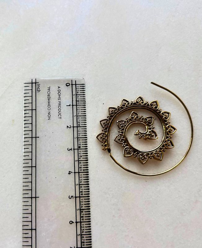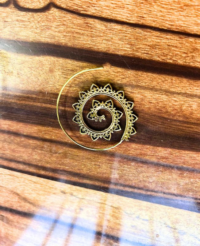 Elegant brass spiral mandala hoop earrings featuring intricate filigree detailing in a heart-petal pattern, blending bohemian artistry with timeless charm.