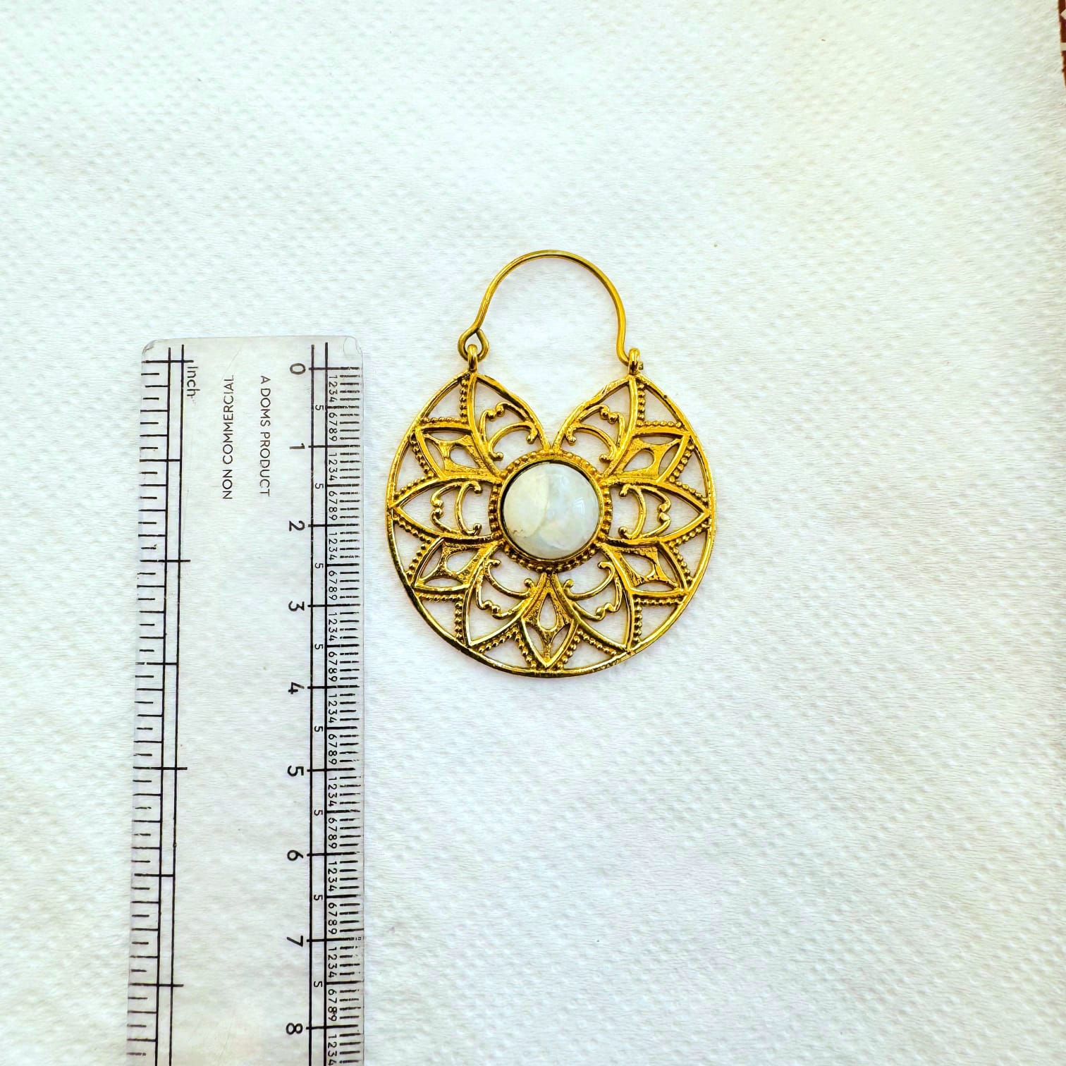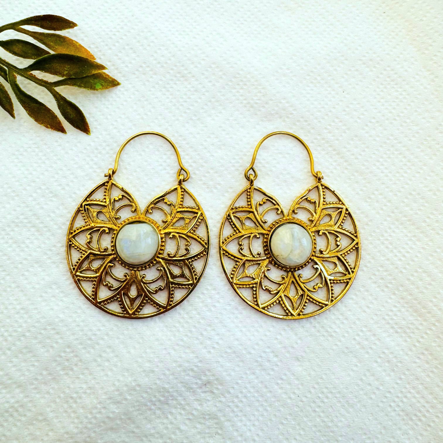 These refined brass mandala hoop earrings showcase a beautifully balanced circular design inspired by sacred geometry and floral motifs. The detailed openwork filigree forms a harmonious mandala pattern, centered around a smooth moonstone cabochon that reflects soft, natural light with subtle iridescence.