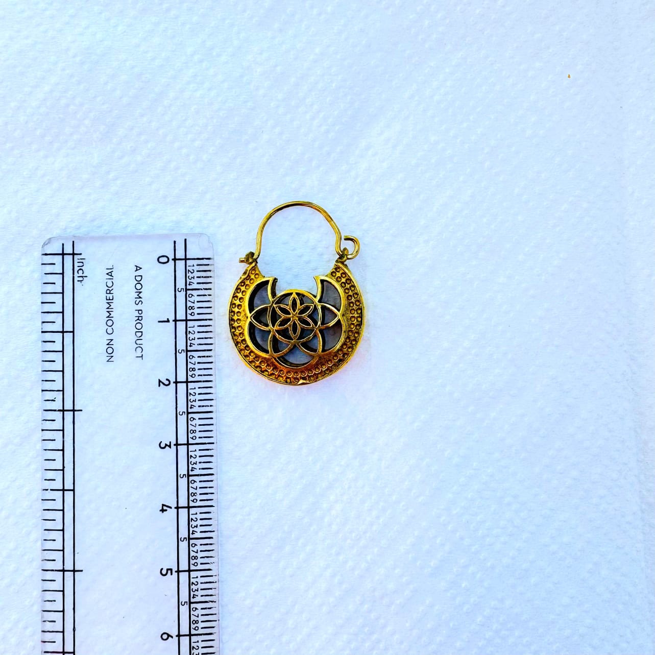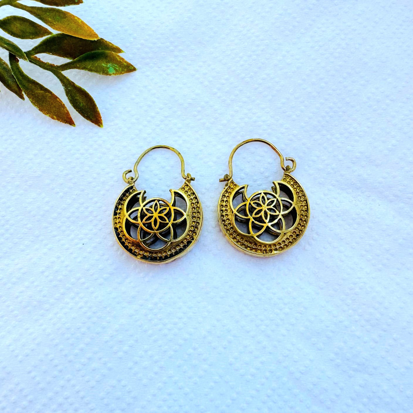 These unique handcrafted brass earrings combine a bold crescent moon silhouette with a detailed geometric flower motif at the center. Inspired by ethnic and bohemian jewelry traditions, they offer a timeless yet eye-catching design that stands out beautifully when worn.