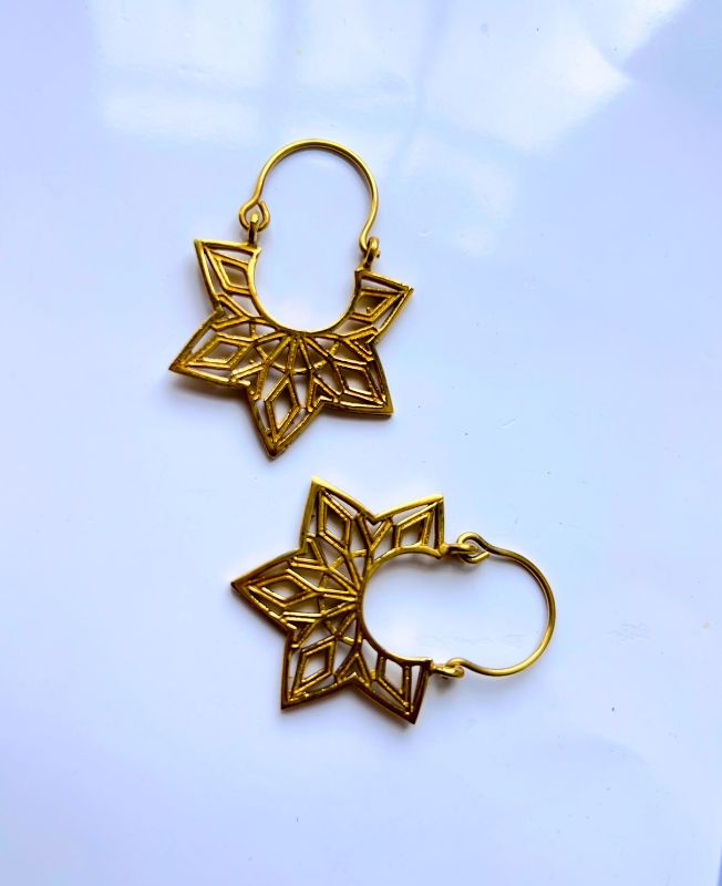 These handcrafted brass earrings showcase an intricate geometric flower design with symmetrical lines and bold angles. Finished in a warm antique gold tone, they offer a perfect balance of structure and elegance. The lightweight construction and striking shape make them an excellent choice for bold yet wearable accessories.