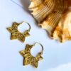 These handcrafted brass earrings showcase an intricate geometric flower design with symmetrical lines and bold angles. Finished in a warm antique gold tone, they offer a perfect balance of structure and elegance. The lightweight construction and striking shape make them an excellent choice for bold yet wearable accessories.