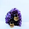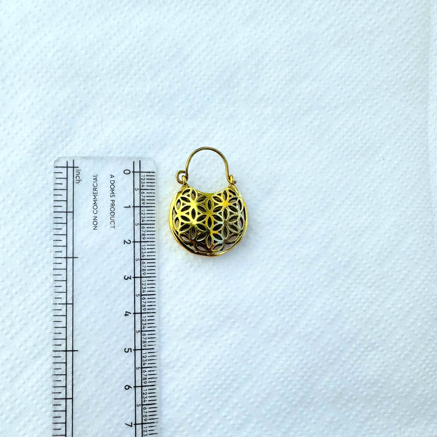 These handcrafted brass earrings showcase a rounded hoop silhouette decorated with a repeating geometric flower motif inspired by sacred and ethnic patterns. The openwork design adds depth and lightness, allowing the earrings to feel comfortable while still making a refined statement.