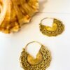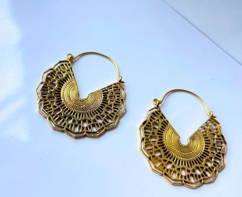 Intricately crafted mandala-inspired brass earrings with geometric cutouts and tribal engraving. Bold and lightweight, perfect for statement looks.