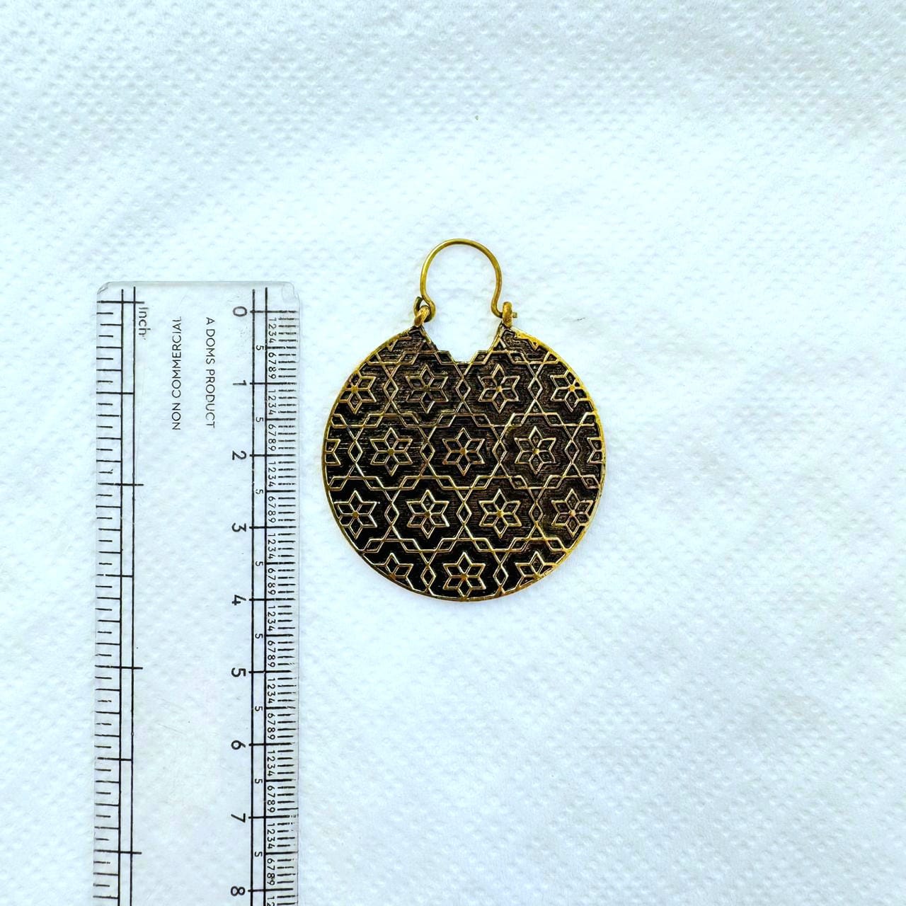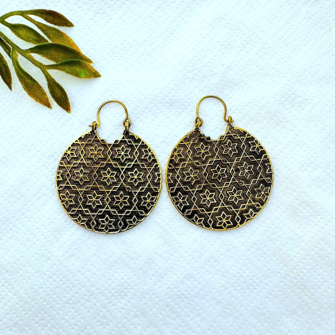 These geometric star brass disc earrings feature a beautifully engraved repeating star motif inspired by traditional geometric and tribal patterns. The darkened recessed background highlights the golden brass lines, creating strong contrast and a rich, textured appearance.