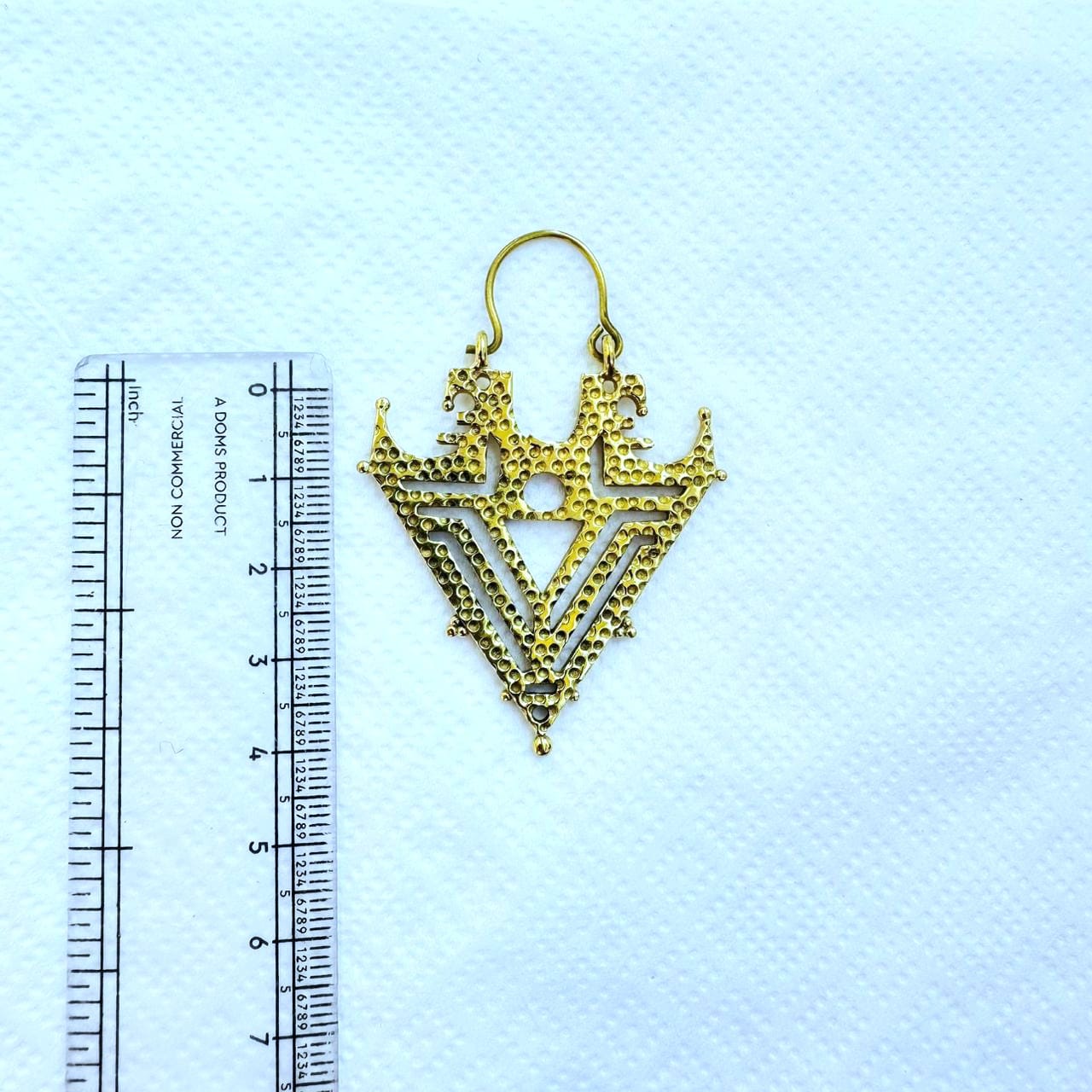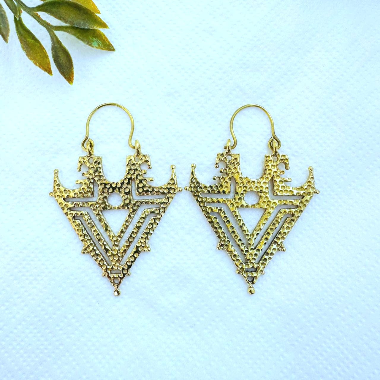 These geometric tribal brass earrings feature a powerful symmetrical design inspired by ancient and ethnic motifs. The layered triangular structure and dotted texture create depth, balance, and a strong visual presence while remaining lightweight for comfortable wear.