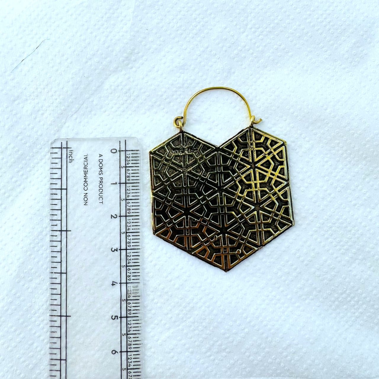 These eye-catching brass earrings feature a striking geometric hexagon shape combined with an intricate openwork filigree pattern. The detailed linear design creates depth and texture, giving the earrings a bold yet refined statement look.