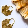Bold geometric earrings with a honeycomb-style hexagonal motif, crafted in antique gold tone for a modern tribal look.