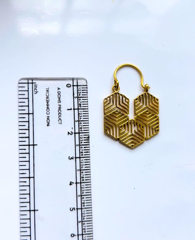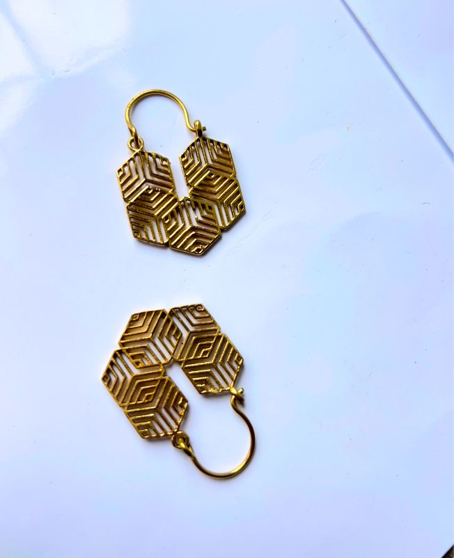 These striking earrings feature a sophisticated honeycomb-inspired design made from layered hexagonal elements with intricate cut-out lines. Made in a rich antique gold finish, they blend modern geometric aesthetics with a subtle ethnic vibe