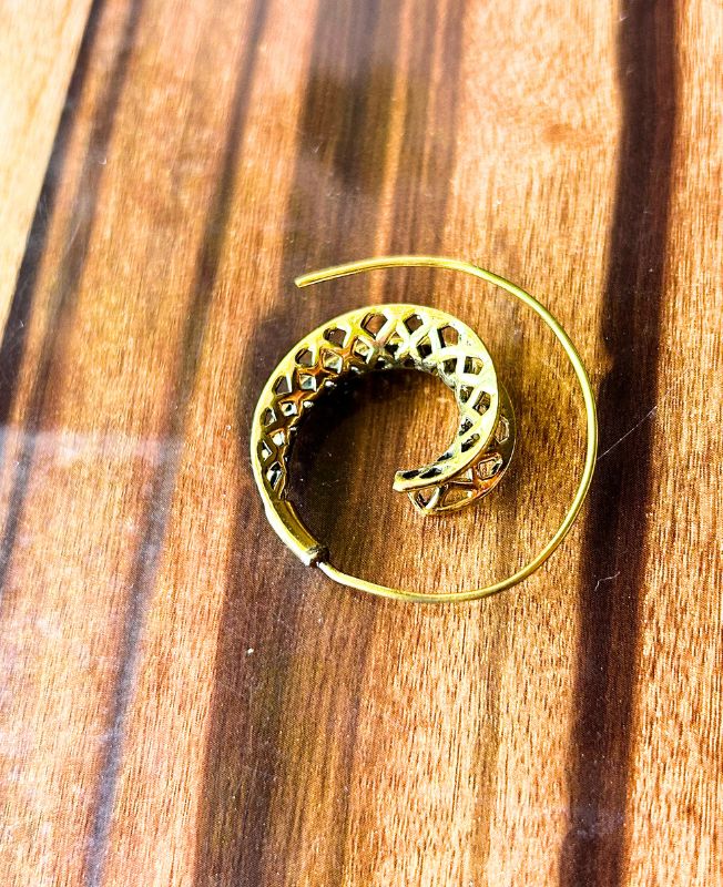 Elegant brass spiral filigree earring with intricate swirl detailing. Lightweight and artistic, this handcrafted design brings a timeless bohemian charm to any look.