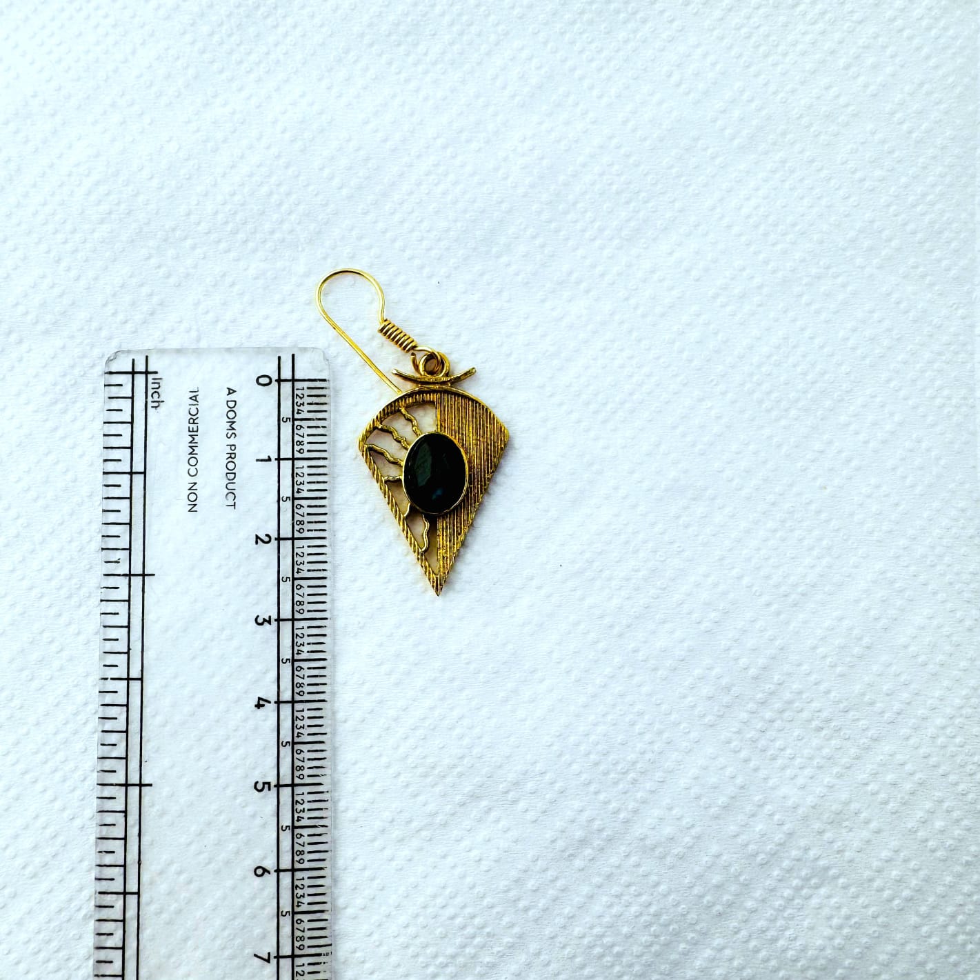These handcrafted brass earrings feature a striking geometric drop silhouette accented with a beautiful oval labradorite stone, known for its deep blue–green flashes. The brass surface is decorated with fine linear textures and organic cut-out details, creating depth and contrast around the stone.