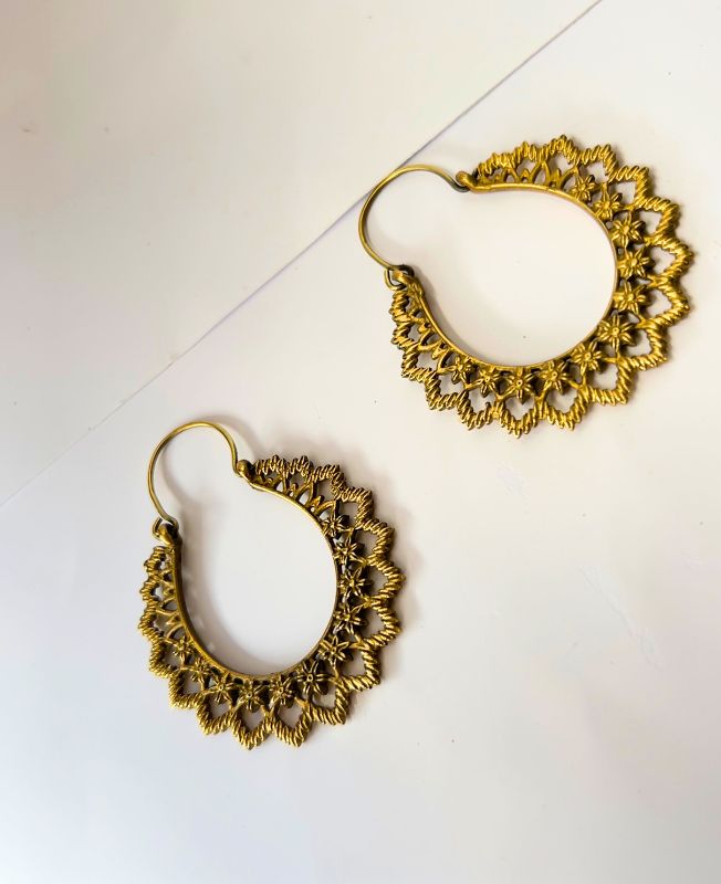 Statement brass earrings with intricate floral and lace-like edges, perfect for boho or tribal-inspired fashion.