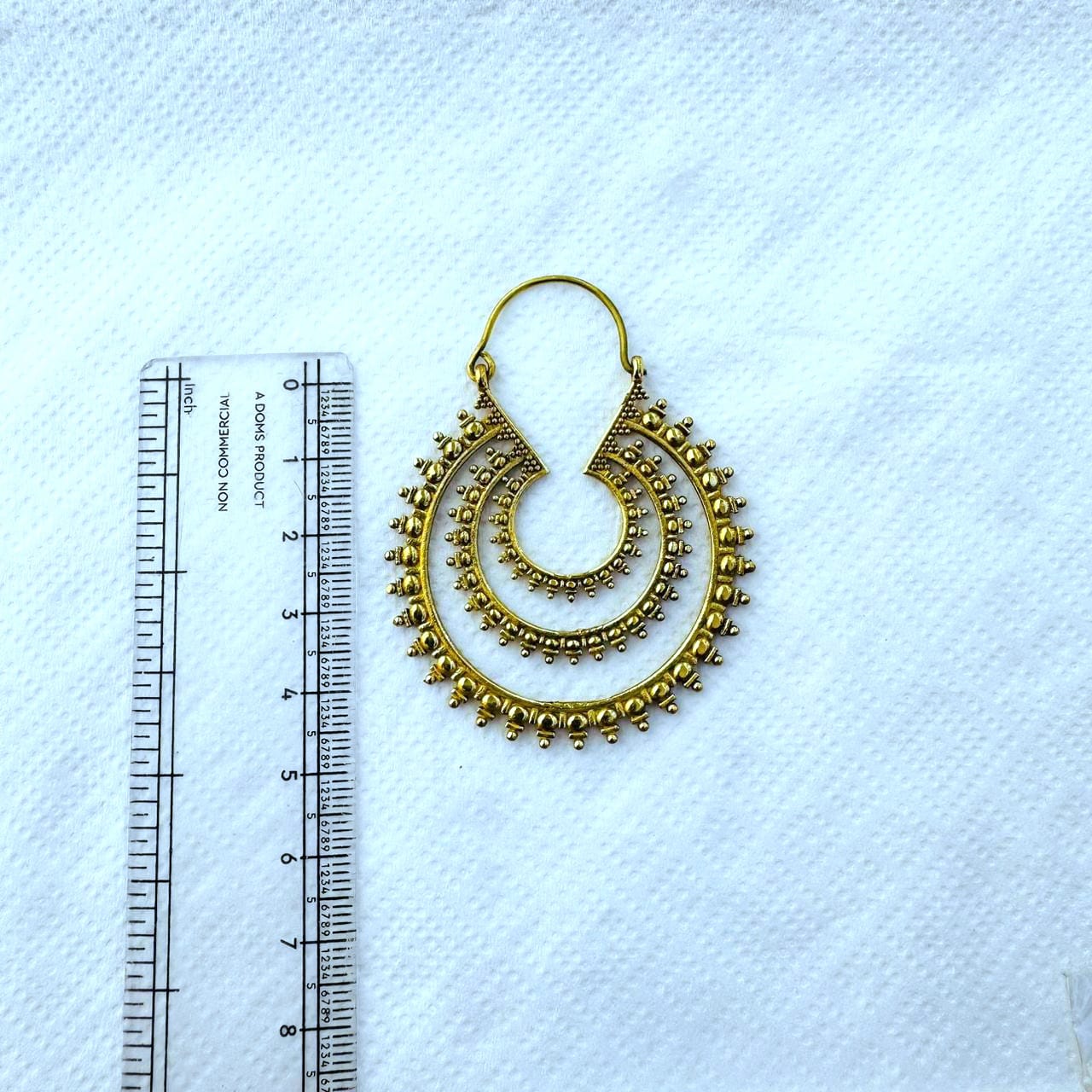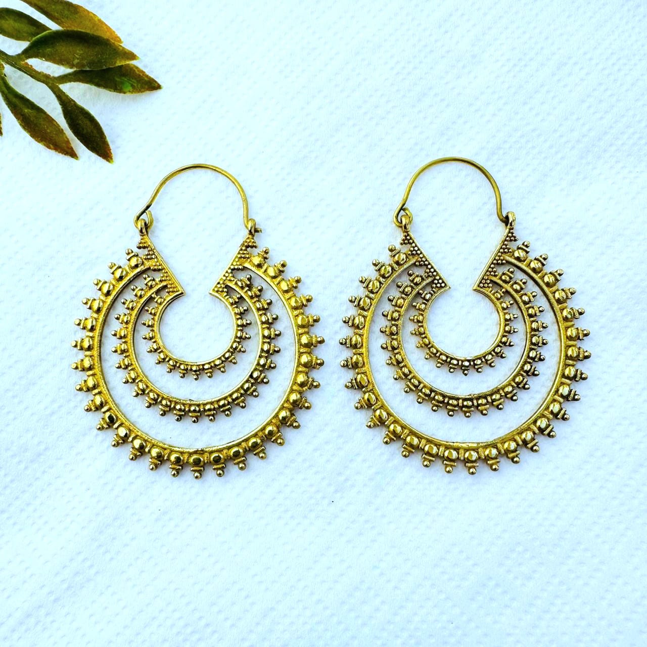 These ornate brass hoop earrings feature a striking layered crescent design accented with fine dotted textures along the edges and inner ring. Inspired by traditional tribal and ethnic jewelry, the open form creates depth and movement while keeping the earrings comfortable for everyday wear.