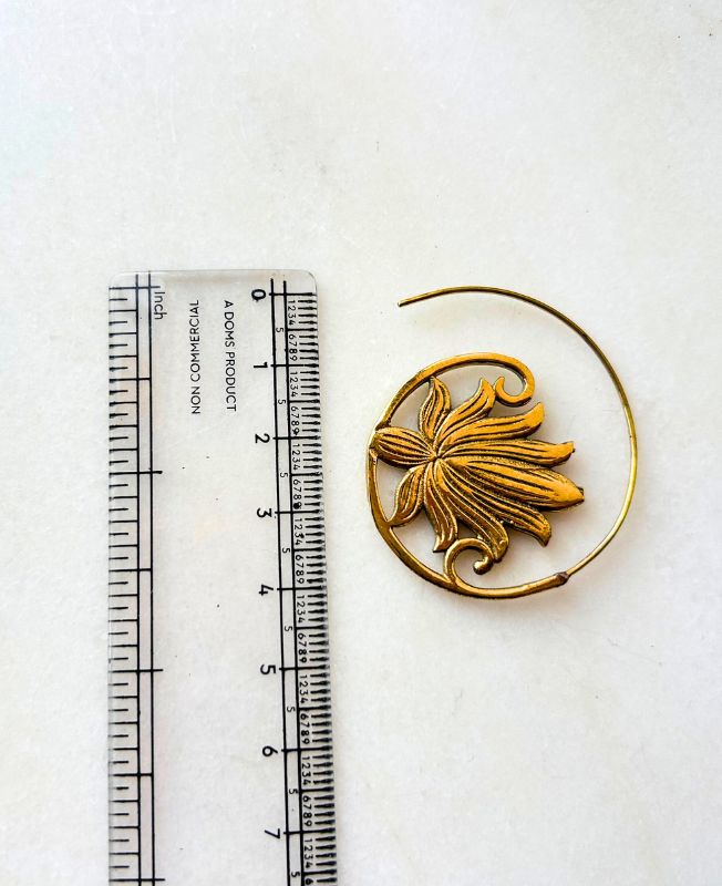 These handcrafted brass hoop earrings feature a beautifully carved flower design that brings a touch of natural grace to any outfit. The intricate floral detailing is enclosed within a smooth circular frame, highlighting both structure and flow. Their lightweight yet durable build makes them perfect for daily wear or for adding an artisan flair to special occasions.