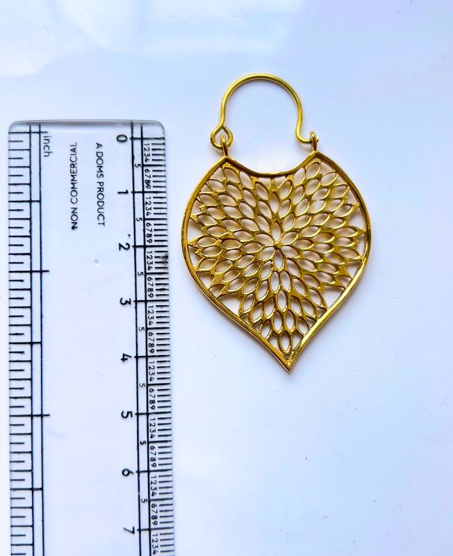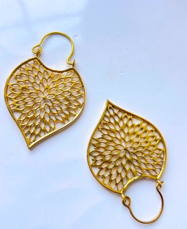 Elegant brass earrings with intricate lotus petal design, finished in a radiant gold tone. Perfect for bold boho or ethnic styles.
