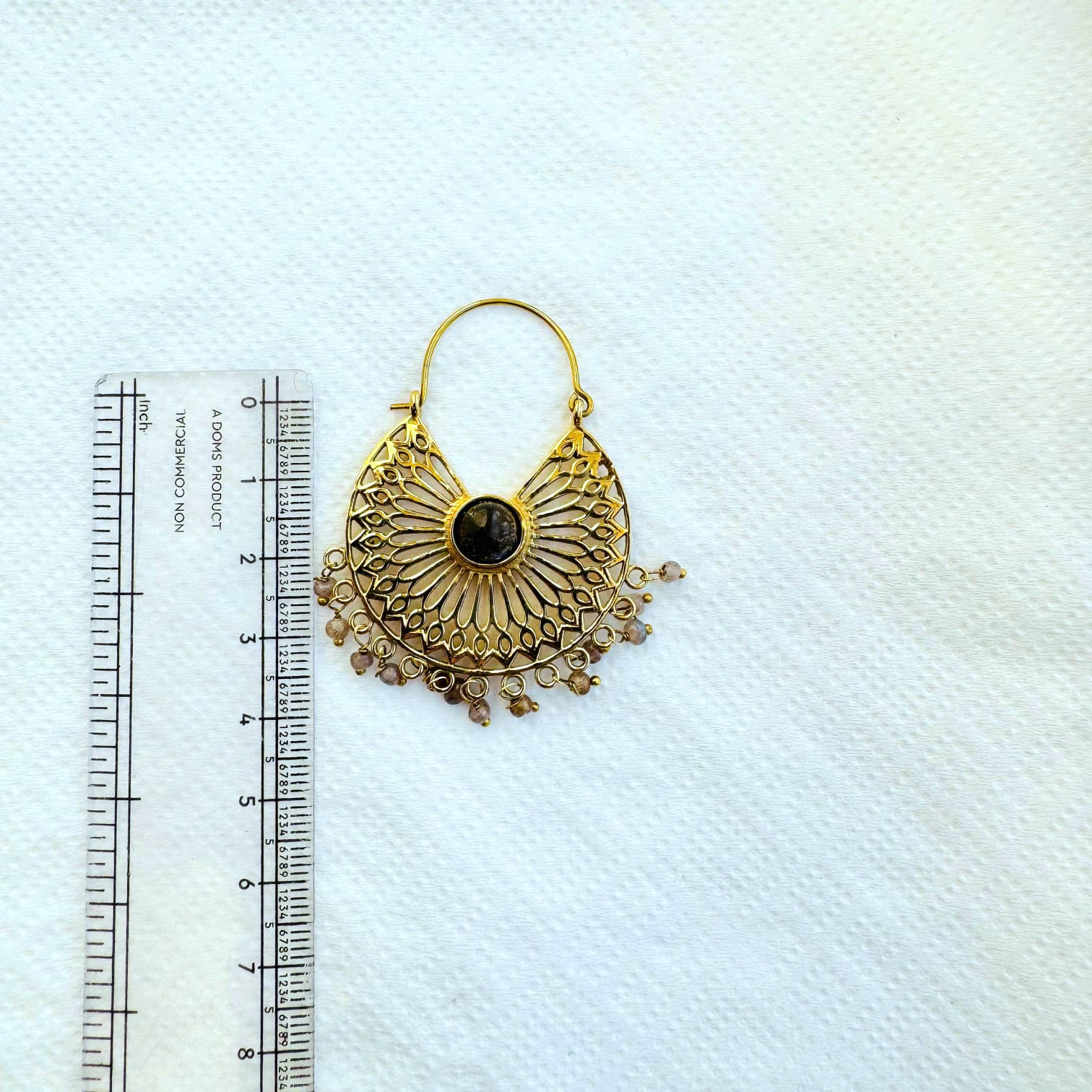 These beautiful brass mandala earrings showcase an ornate floral filigree pattern radiating around a natural moonstone cabochon. The layered openwork design creates depth and movement, while the soft glow of the moonstone adds a calm, mystical touch.