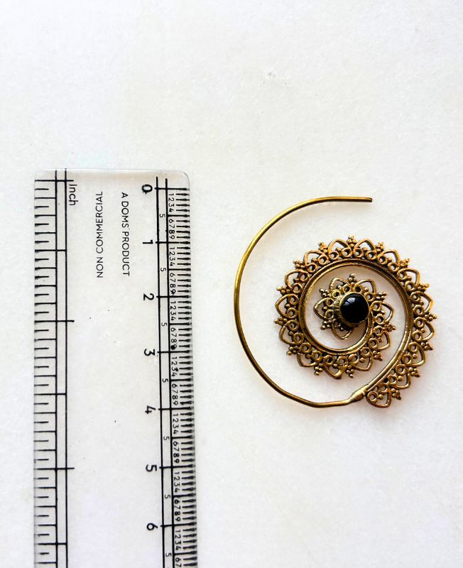 Elegant handcrafted spiral earrings made from solid brass, featuring an intricate mandala-style filigree pattern and a central black stone accent. Perfect for boho and tribal-inspired jewelry collections.