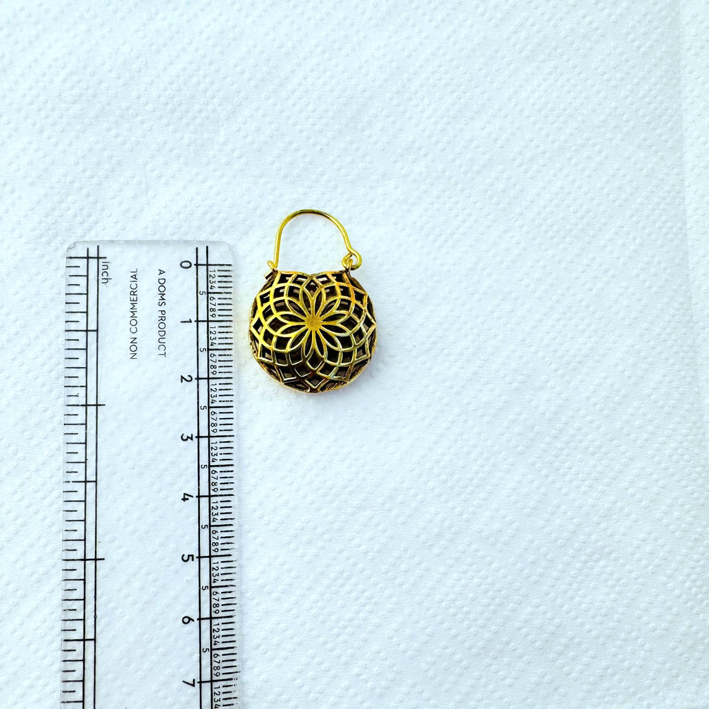 These handcrafted brass earrings showcase a beautifully symmetrical mandala-inspired floral pattern set within a rounded silhouette. The layered openwork geometry creates depth and allows light to pass through, giving the earrings an airy yet refined appearance.