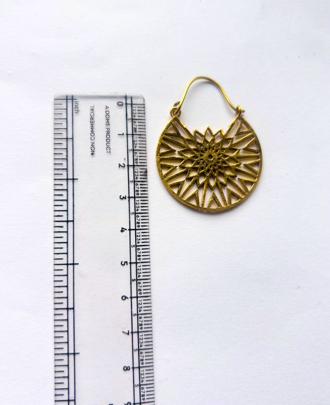Intricately designed mandala hoop earring with a bold, geometric pattern. Made from raw brass, perfect for bohemian and tribal jewelry designs.