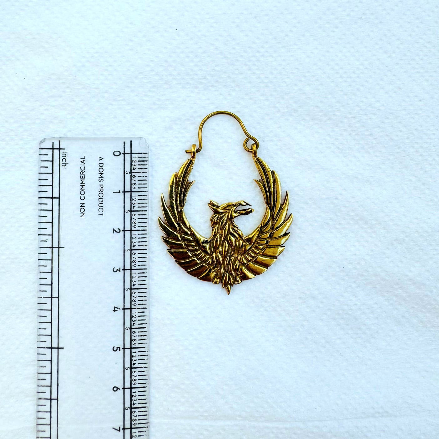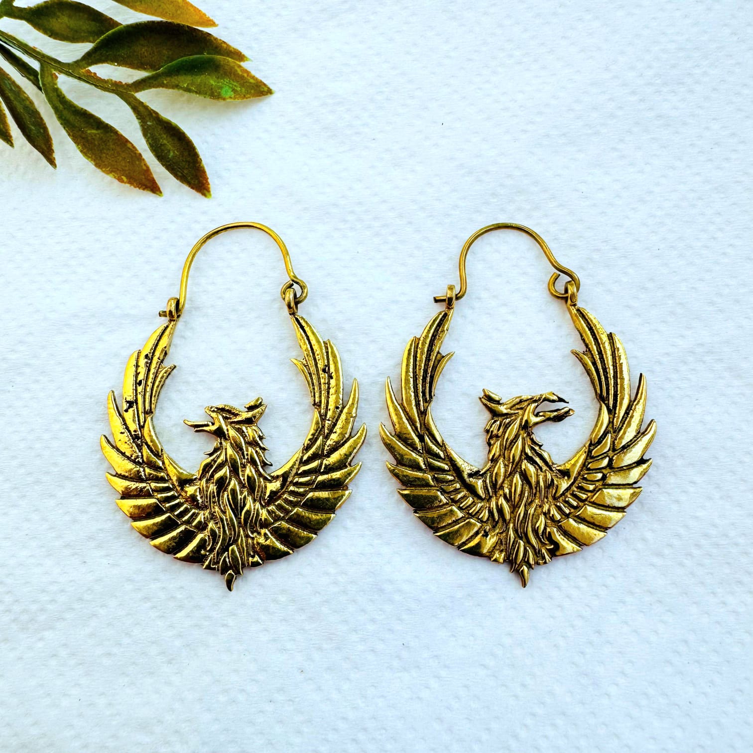 These striking brass phoenix earrings showcase a powerful mythical bird with fully spread wings, captured in rich detail and framed within an elegant hoop shape. The phoenix is a timeless symbol of rebirth, resilience, and inner strength, making these earrings both meaningful and visually impactful.
