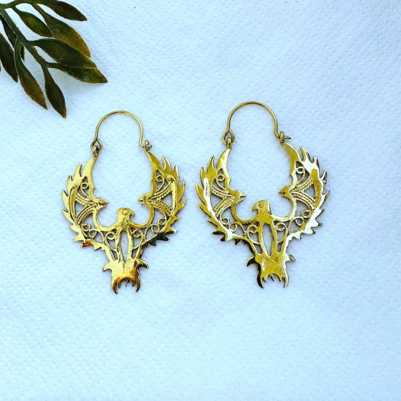 These mythical phoenix brass earrings feature an intricately detailed bird with outstretched wings, inspired by ancient symbolism of renewal, power, and transformation. The openwork design keeps them lightweight while allowing the rich golden brass to catch the light beautifully.
