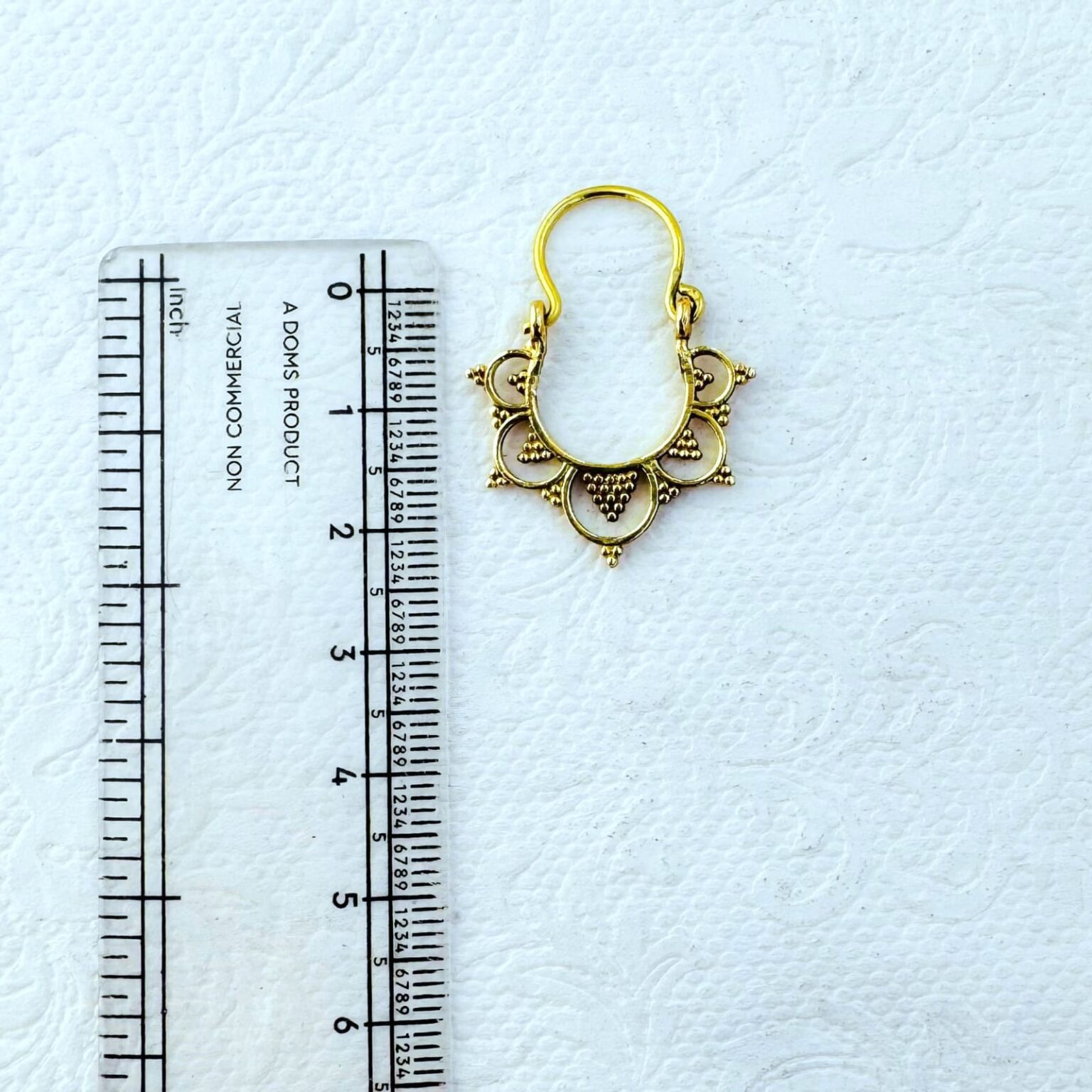 These earrings are inspired by traditional mandala and sunburst motifs, symbolizing harmony and light. The design features a series of delicate arches adorned with precise granular dot-work, creating a textured, lace like appearance in radiant gold-tone brass.