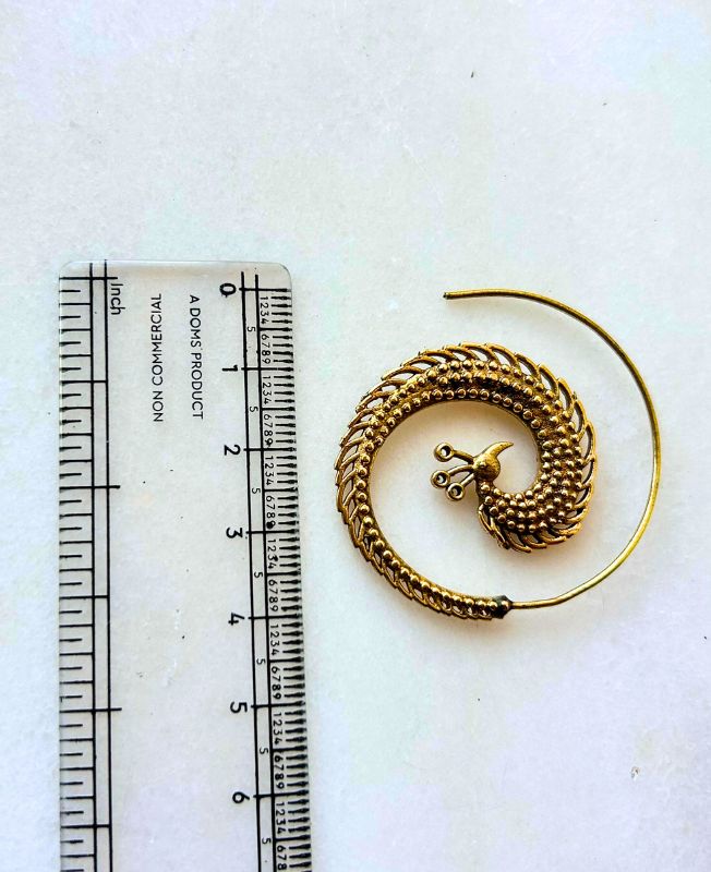 Elegant handcrafted brass spiral earrings featuring an intricate peacock motif, a perfect blend of traditional artistry and contemporary boho charm.