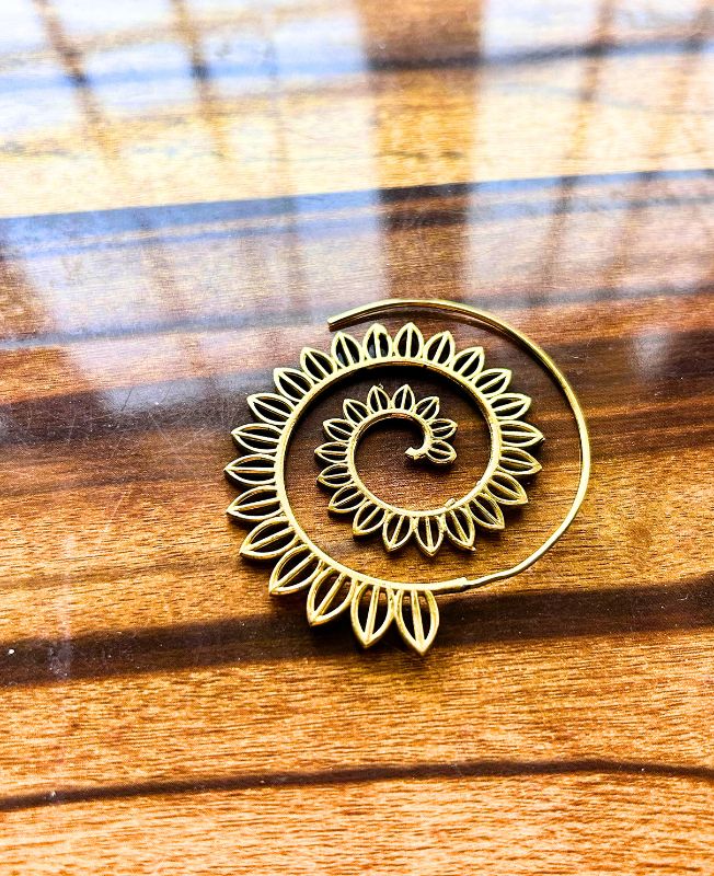Elegant handcrafted brass spiral earrings with intricate petal filigree design, a perfect fusion of bohemian charm and artisan craftsmanship.