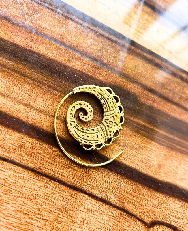 Intricately designed brass spiral earrings featuring detailed tribal filigree patterns. Lightweight yet bold, these earrings add a unique bohemian touch to any outfit.