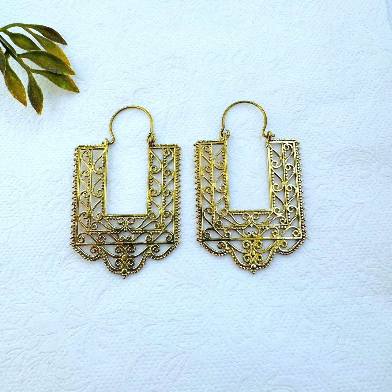These statement brass earrings showcase a striking rectangular silhouette adorned with delicate, hand-inspired filigree scrollwork. The open geometric frame combined with ornate curves creates a beautiful contrast between structure and softness, making these earrings both bold and elegant.