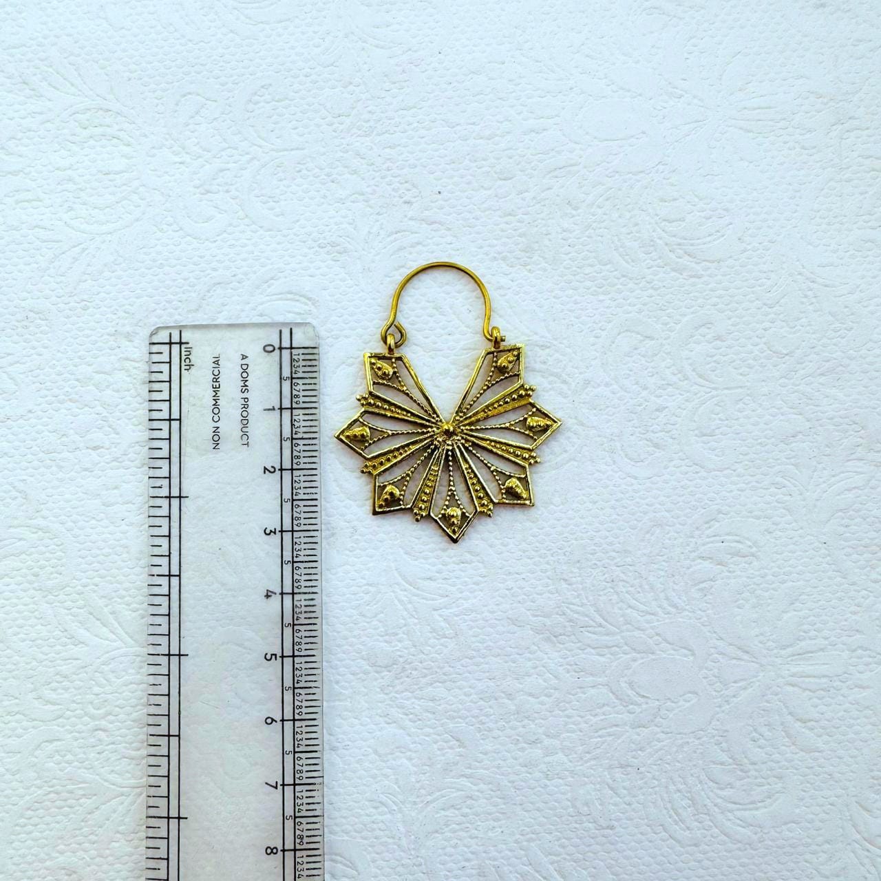 These sunburst mandala brass earrings are a bold yet refined statement piece inspired by geometric symmetry and traditional ornamental patterns. The layered, fan like design radiates outward from a central point, creating a striking mandala or starburst effect that catches the light beautifully.