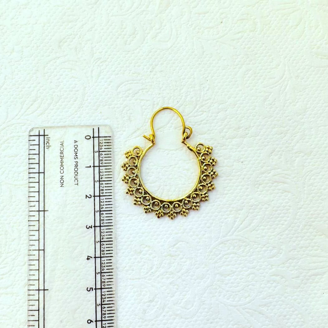 Handcrafted gold plated brass earring featuring a delicate scalloped edge reminiscent of blooming petals. Lightweight and perfect for a bold yet elegant look.