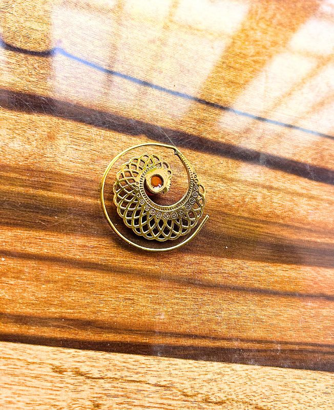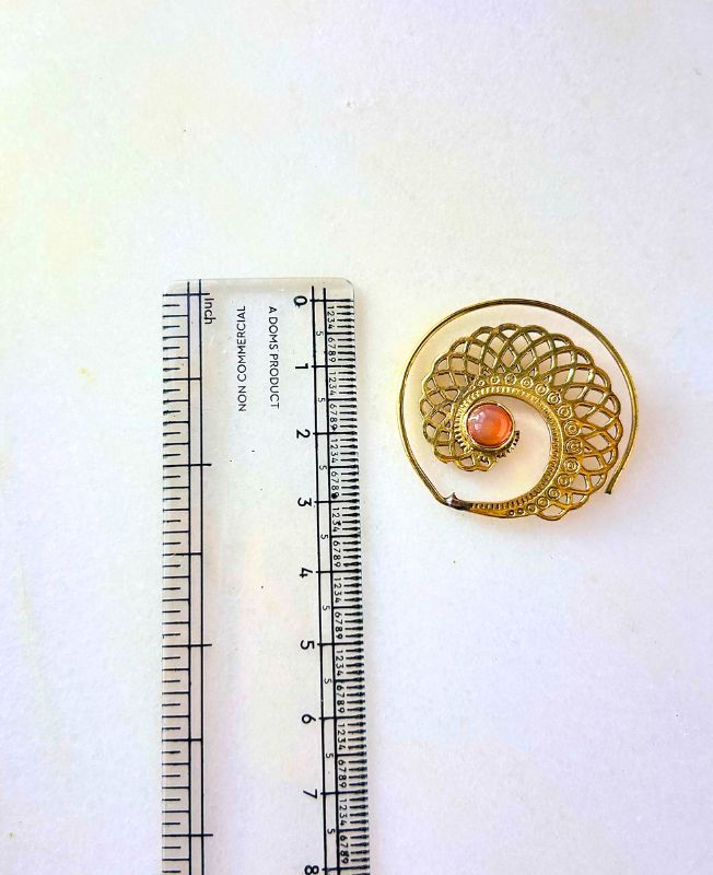 This exquisite brass spiral filigree pendant showcases delicate handwork inspired by vintage artistry. The circular spiral form symbolizes growth and evolution, while the warm brass tones add a sense of heritage and depth. At the center rests a smooth coral-colored stone, beautifully contrasting the golden metalwork and adding a pop of color