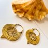 These bold brass earrings feature a symmetrical mandala star motif, framed by concentric dotted layers in an antique gold tone they offer an elegant ethnic accent perfect for boho, tribal, or festival-inspired fashion. The secure hoop clasp makes them ideal for everyday wear or standout occasions