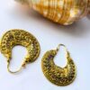Antique gold-toned hoop earrings featuring intricate floral and swirl filigree patterns, ideal for traditional and bold looks.