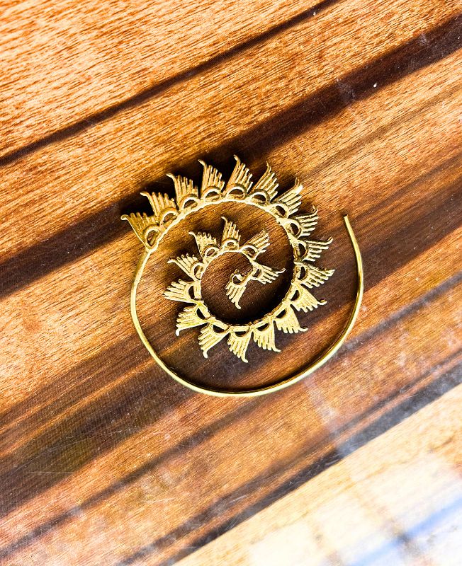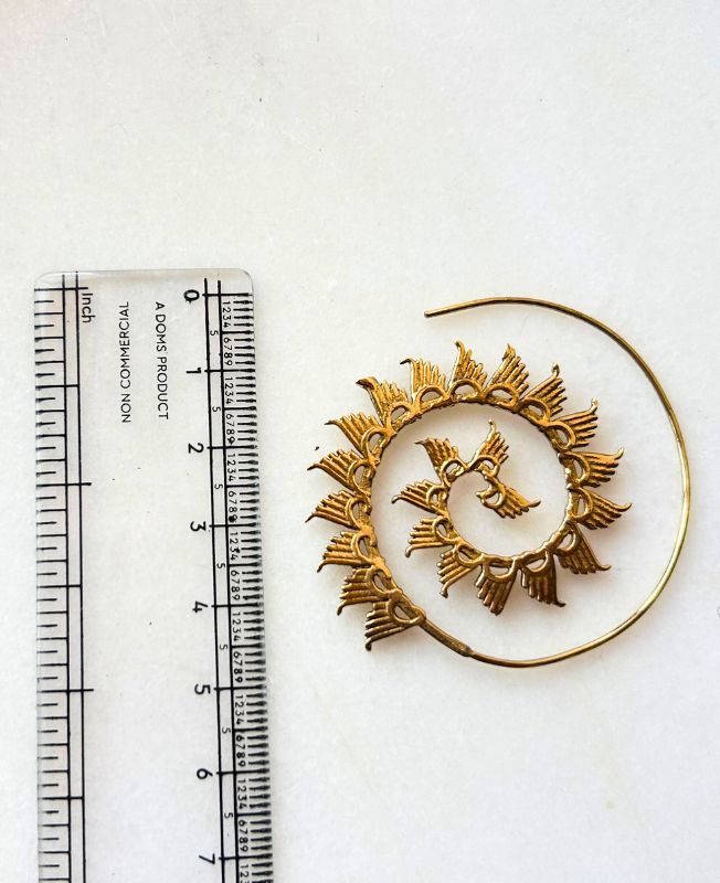 These handcrafted brass spiral hoop earrings feature a beautifully detailed tribal design with petal-like accents radiating from the center. Each curve and engraving is carefully finished, giving them an authentic ethnic touch and a captivating golden shine.