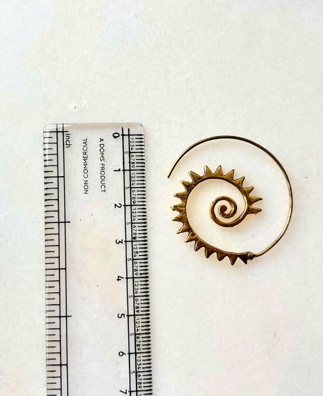 This stunning brass spiral earring draws inspiration from the energy of the sun. The intricate spiked spiral pattern symbolizes strength, movement, and balance. Each piece is artisan-made, resulting in slight variations that add to its unique appeal. Perfect for casual or festive wear, this earring pairs beautifully with other bohemian accessories or can stand alone as a statement piece.
