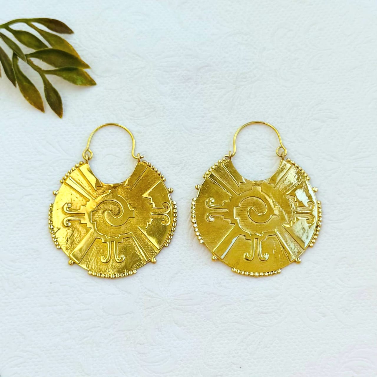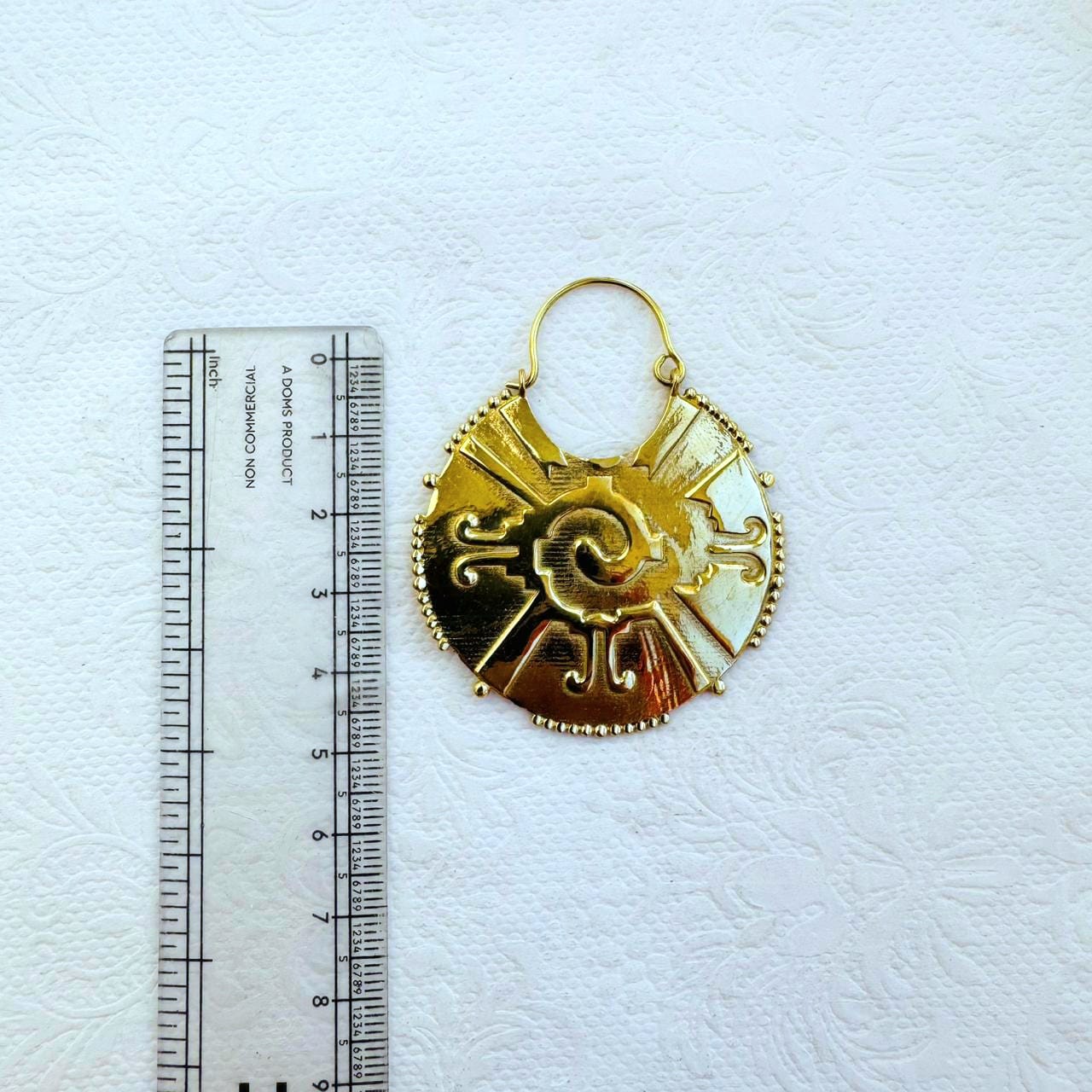 Handcrafted gold plated brass earring featuring an intricate design with an embossed sun inspired symbol and radiant engraved detailing. Lightweight and perfect for a bold yet elegant look.